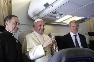 Ritorno sull’Africa. Questo l’ho detto in un altro viaggio. C’è nell’inconscio collettivo un motto: l’Africa va sfruttata. È una cosa inconscia. Noi non pensiamo mai: l’Europa va sfruttata, no. L’Africa va sfruttata. E noi dobbiamo liberare l’umanità da questo inconscio collettivo. Il punto più forte dello sfruttamento, non solo in Africa ma nel mondo, è l’ambiente, la deforestazione, la distruzione della biodiversità. Un paio di mesi fa, ho ricevuto i cappellani della gente di mare e nell’udienza c’erano sette ragazzi pescatori che pescavano con una barca che non era più lunga di questo aereo. Pescavano con mezzi meccanici come si usa adesso, un po’ avventurieri. Mi hanno detto questo: da alcuni mesi fino ad oggi abbiamo preso 6 tonnellate di plastica. (In Vaticano abbiamo proibito la plastica, stiamo facendo questo lavoro). 6 tonnellate di plastica! Questa è una realtà, soltanto dei mari… L’intenzione di preghiera del Papa di questo mese è proprio la protezione degli oceani, che ci danno anche l’ossigeno che respiriamo. Poi ci sono i grandi “polmoni” dell’umanità, uno in Africa centrale, l’altro in Brasile, tutta la zona panamazzonica; e poi ce n’è un altro, non ricordo dove… Ci sono anche piccoli polmoni dello stesso genere. Difendere l’ecologia, la biodiversità, che è la nostra vita, difendere l’ossigeno. A me fa sperare che la lotta più grande per la biodiversità, per la difesa dell’ambiente, la portano avanti i giovani. Hanno una grande coscienza, perché loro dicono: il futuro è nostro; voi, col vostro, fate quello che volete, ma non col nostro! Incominciano a ragionare un po’ di questo. Credo che essere arrivati all’accordo di Parigi è stato un passo avanti buono. Poi l’ultimo di Marrakech… Sono incontri che aiutano a prendere coscienza. Ma l’anno scorso, d’estate, quando ho visto quella foto della nave che navigava al Polo Nord come se niente fosse, ho provato angoscia. E poco tempo fa, alcuni mesi fa abbiamo visto tutti la fotografia dell’atto funebre che hanno fatto, credo in Groenlandia, su quel ghiacciaio che non c’era più, hanno fatto un atto funebre simbolico per attirare l’attenzione. Questo sta avvenendo in fretta, dobbiamo prendere coscienza, cominciando dalle cose piccole. Ma la Sua domanda era: i governanti stanno facendo tutto il possibile? Alcuni di più, alcuni di meno. Qui c’è una parola che devo dire, che sta alla base dello sfruttamento ambientale… (Sono rimasto commosso dall’articolo sul “Messaggero” del 4 settembre, il giorno in cui siamo partiti, dove Franca Giansoldati non ha risparmiato parole, ha parlato di manovre distruttive, di rapacità… Ma questo non solo in Africa ma anche nelle nostre città, nelle nostre civiltà)…La parola brutta, brutta è “corruzione”. Io ho bisogno di fare questo affare, ma per questo devo deforestare, e ho bisogno del permesso del governo, del governo provinciale, nazionale, non so, e vado dal responsabile e la domanda – ripeto letteralmente ciò che mi ha detto un imprenditore spagnolo – la domanda che ci sentiamo fare quando vogliamo che ci approvino un progetto è: “Per me quanto?”, sfacciatamente. Questo succede in Africa, in America Latina e anche in Europa. Dappertutto, quando si prende la responsabilità socio-politica come un guadagno personale, lì si sfruttano valori, si sfrutta la natura, la gente. Pensiamo: “l’Africa va sfruttata”. Ma pensiamo a tanti operai che sono sfruttati nelle nostre società: il caporalato non l’hanno inventato gli africani, l’abbiamo in Europa. La domestica pagata un terzo di quello che si deve, non l’hanno inventato gli africani; le donne ingannate e sfruttate per fare la prostituzione nelle nostre città, non l’hanno inventato gli africani. Anche da noi c’è questo sfruttamento, non solo ambientale, anche umano. E questo è per corruzione. Quando la corruzione entra nel cuore, prepariamoci, perché avviene di tutto.