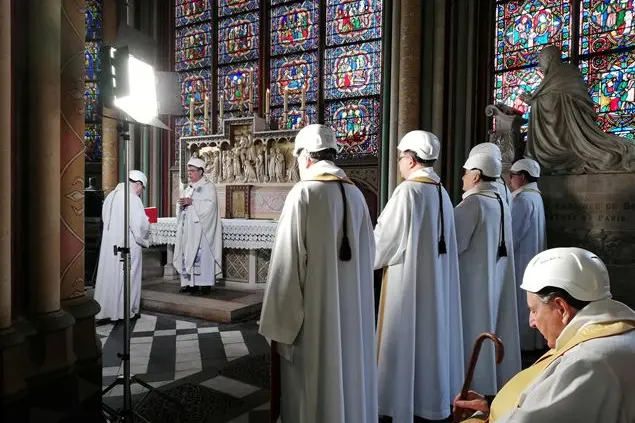 Entrano in processione, tutti con un casco bianco in testa, anche l’arcivescovo di Parigi Michel Aupetit, sicurezza oblige. Sono quattordici sacerdoti e una ventina di fedeli tra cui alcuni degli operai che lavorano nei cantieri. Si celebra la festa della Dedicazione, che ricorda – come avviene per ogni altra chiesa – l’atto con cui la Basilica di Notre-Dame è stata consacrata e destinata al culto, nel XII secolo. Una messa vespertina senza suoni di campane, senza cori imponenti, in tono dimesso, ma con un raccoglimento e un’emozione ben visibili sul volto dei celebranti e dei pochi fedeli ammessi nella cappella dei Cavalieri del Santo Sepolcro, dietro l’altare principale. Qui si custodiva la preziosa reliquia della corona di spine, quella stessa che secondo la tradizione i carnefici posero per scherno sul capo di Gesù durante la sua Passione, e che si è salvata dallo spaventoso rogo del 15 aprile scorso.