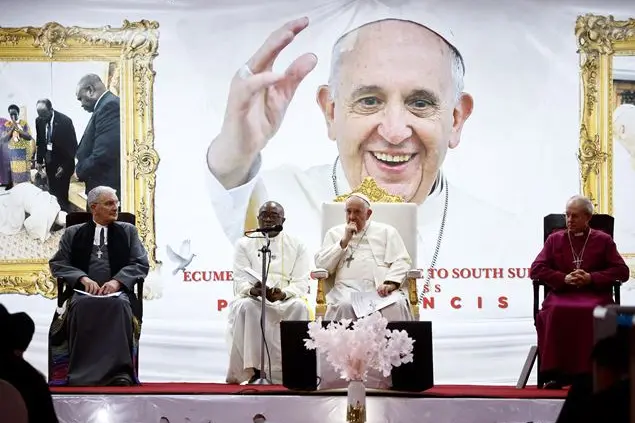 Papa Francesco, seduto tra il Moderatore dell’Assemblea Generale della Chiesa di Scozia, Iain Greenshields, e l’Arcivescovo di Canterbury, Justin Welby, prova a rispondere agli interrogativi dei presenti. Uno su tutti «Perché stiamo a soffrire nel campo per sfollati?». La causa, ricorda il Papa sono le «devastazioni prodotte dalla violenza umana, oltre che per quelle causate dalle inondazioni, che milioni di nostri fratelli e sorelle come voi, tra cui tantissime mamme con i bambini, hanno dovuto lasciare le loro terre e abbandonare i loro villaggi, le loro case. Purtroppo in questo martoriato Paese essere sfollato o rifugiato è diventata un’esperienza consueta e collettiva».