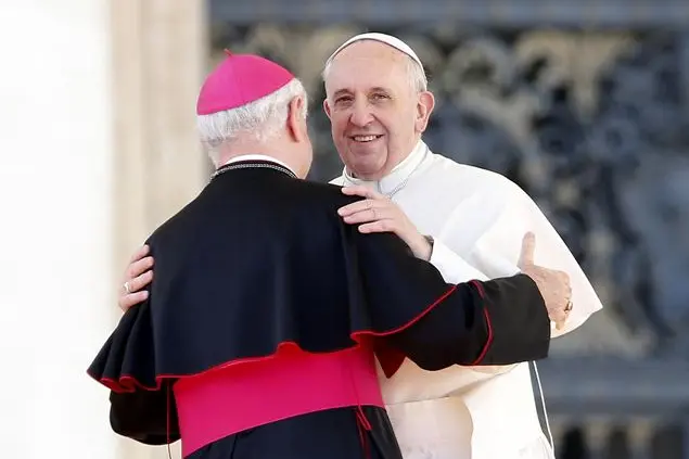 In copertina, un abbraccio tra monsignor Vincenzo Paglia e papa Francesco durante l'udienza di San Valentino in Piazza San Pietro il 14 febbraio 2014 (foto Ansa)