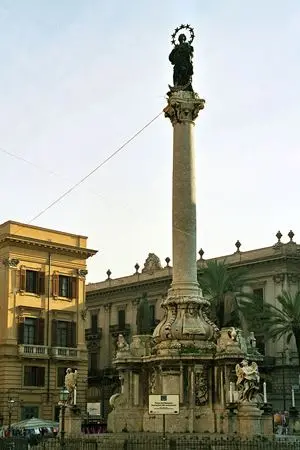 Provvidenziale risultò l’intraprendenza del domenicano padre Tommaso Maria Napoli (Palermo 1659-1725). Egli seppe coniugare da una parte il desiderio dell’Imperatore d’Austria e re di Sicilia Carlo VI, di realizzare un nuovo monumento all’Immacolata, dopo la distruzione durante una rivolta, di quello di Barcellona, da lui fatto costruire mentre era Re di Spagna (1703-1711) in riconoscenza per la vittoria sul rivale Filippo V, e dall’altra parte il vivo desiderio dei Domenicani di dare degna sistemazione architettonica alla facciata della loro monumentale chiesa (assieme a quella dei Benedettini di Catania, la più grande della Sicilia), che proprio in quel periodo stava per essere ultimata. Così si esprimeva lealtà al sovrano, riparando all’oltraggio da lui subito, e domandando che il nuovo monumento sorgesse davanti alla loro chiesa, si chiedeva altresì una piazza, che al momento non esisteva.