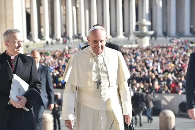 Nel discorso all’udienza ha parlato del Concilio e della santità, osservando che “un grande dono del Concilio è aver recuperato una visione di Chiesa fondata sulla comunione e aver ricompreso anche il principio della autorità e della gerarchia in tale prospettiva”. E ciò, ha aggiunto, “ha aiutato a capire meglio che tutti i cristiani in quanto battezzati hanno uguale dignità davanti al Signore e sono accomunati da una unica vocazione, quella alla santità”. La santità “non è qualcosa che ci procuriamo noi o otteniamo noi con le nostre capacità o qualità, la santità è un dono che ci fa il Signore Gesù quando ci prende con sé e ci riveste di se stesso”. Commentando la lettera di san Paolo agli Efesini, il Papa ha osservato che “tutto questo ci fa comprendere che per essere santi non bisogna per forza essere vescovi, preti, religiosi, no, tutti siamo chiamati alla santità, è una vocazione universale. Tante volte siamo tentati di pensare che la santità sia riservata solo a coloro che hanno la possibilità di staccarsi dalle faccende ordinarie per dedicarsi solo alla preghiera, ma non è così, qualcuno pensa che la santità è chiudere gli occhi, fare la faccia così, la faccia da immaginetta, ma non è così”. Il papa al termine ha anche ricordato le vittime dell’alluvione nel Nord Italia.