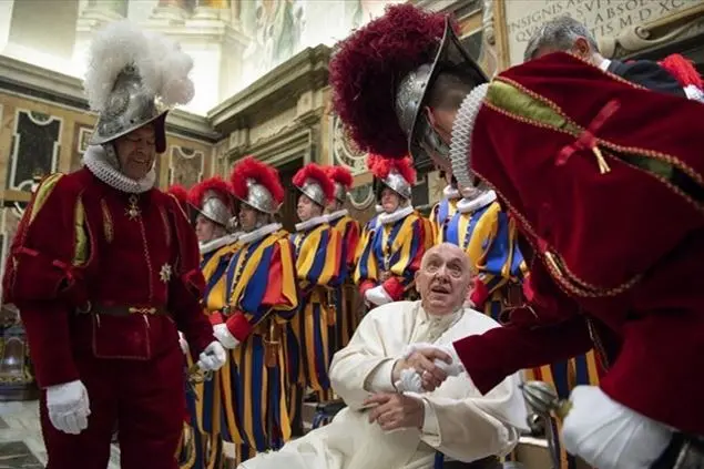 La vostra festa annuale, con il giuramento delle reclute, è una bella occasione per incontrarvi e accogliere i genitori e i familiari che si uniscono a voi in questi momenti così significativi. A tutti voi do il mio benvenuto! Saluto e ringrazio il Colonnello Christoph Graf, il Cappellano, gli Ufficiali, anche il nuovo Vice Comandante - benvenuto! -, i Sottufficiali e tutti i componenti del Corpo. Rivolgo un pensiero particolare a voi nuove reclute, che, attraverso il giuramento, verrete introdotte nella grande famiglia della Guardia Svizzera. Con ciò vi disponete a dedicare alcuni anni della vostra vita a un compito affascinante e, al tempo stesso, ricco di responsabilità nel cuore della Chiesa universale.
