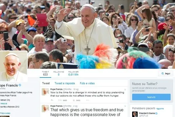 «Effetto Sudamerica sull’account @Pontifex di Twitter. Si è appena concluso il viaggio apostolico di Francesco in Ecuador, Bolivia e Paraguay e i follower del Papa - nelle nove lingue in cui si distribuisce l’account - hanno oltrepassato i ventidue milioni. E questo a quarantadue giorni di distanza da quello in cui si era toccata quota ventuno milioni». Lo scrive L’Osservatore Romano e lo rilancia l'agenzia di stampa Sir. «Il grande impatto a livello mondiale avuto sul social network dalla visita del Papa nei tre Paesi sudamericani è evidente - prosegue il giornale -. Commenti, discussioni, retweet si sono rincorsi nella rete, alimentati dalla diffusione dei discorsi del Pontefice e dalle immagini postate dagli organi d’informazione, ma anche da chi si trovava fra i milioni di fedeli che nei giorni scorsi hanno seguito Francesco».
