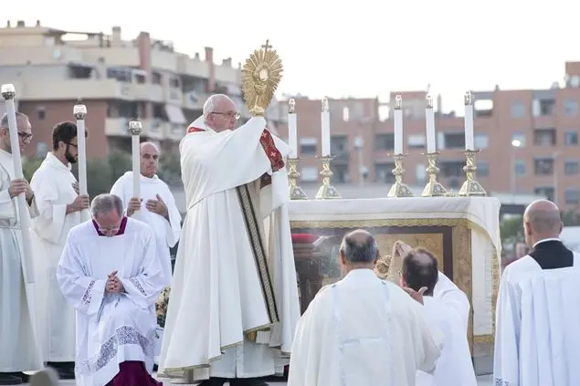 Le vie di Ostia, attraversate dalla processione del Corpus Domini, tornano per una sera in mano ai cittadini. Papa Francesco, che ha voluto qui la celebrazione proprio per dare la sua vicinanza al quartiere ostaggio della malavita, passa l’ostensorio a monsignor Angelo De Donatis, vicario di Roma che riceverà la porpora nel concistoro di fine mese, e che lo porta in processione tra la gente. Un chilometro e trecento metri in tutto, partendo dalla parrocchia di Santa Monica e arrivando a quella di Nostra Signora di Bellaria dove Francesco dà la benedizione. Il cammino, animato dalle otto parrocchie del X Municipio di Roma (con le due già citate anche San Nicola di Bari, Santa Maria Regina Pacis, Sant'Agostino Vescovo, San Vincenzo de' Paoli, Santa Maria Stella Maris e Sant'Aurea) è stato seguito da una folla numerosa. Insieme con i canti anche alcune brevi meditazioni preparate dalle stesse parrocchie.