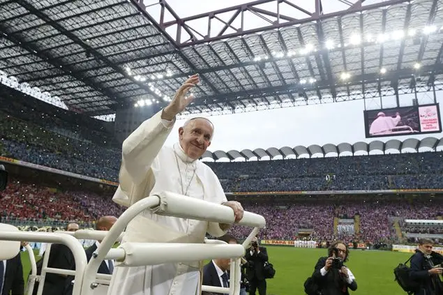 Era l'appuntamento tipicamente meneghino di questo viaggio di papa Francesco e i cresimandi, insieme ai loro genitori, catechisti, padrini e madrine, riempiono completamente lo stadio di San Siro che per la prima volta quest'anno fa il tutto esaurito. Francesco arriva poco prima delle 18 e fa il giro del prato salutando i ragazzi che sono sugli spalti e gridano a ritmo: «Fra-nce-sco, Fra-nce-sco». È un colpo d’occhio bellissimo e colorato perché ogni zona pastorale della grande diocesi ambrosiana ha scelto un colore diverso per le pettorine indossate dai ragazzi: rosso per Milano, rosa per Varese, arancione per Lecco, azzurro per Rho, blu per Monza, verde per Melegnano e giallo per Sesto.