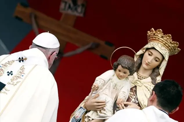 (in alto: papa Francesco in preghiera davanti alla statua della Vergine Maria a Villavicencio, 8 settembre 2017, durante il Viaggio Apostolico in Colombia)
