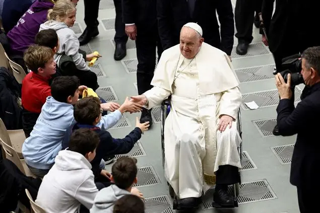 (Foto Reuters: il Papa saluta i bambini durante l'Udienza giubilare in aula Paolo VI)