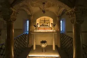 Tra le sette edicole che interpretano la fatica di chi sale “le scale della vita” e i tanti ex-voto appesi alle pareti dai devoti che ringraziano il santo per una grazia ricevuta (una guarigione, uno scampato pericolo, la nascita tanto attesa di un figlio, l’amore del coniuge), si arriva infine alla Chiesa Maggiore di San Romedio e l’attigua Chiesa Antica. Il percorso si conclude nella cella originaria col sacello delle reliquie. Il viaggio-salita termina cioè dove la storia ebbe inizio, lassù sul punto più alto della cuspide rocciosa, dove l’eremita avrebbe costruito la prima chiesetta, o almeno avrebbe piantato una povera croce di legno, e dove venne sepolto.