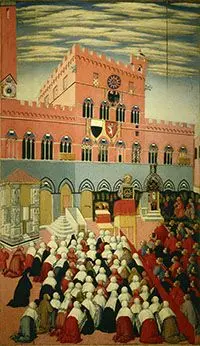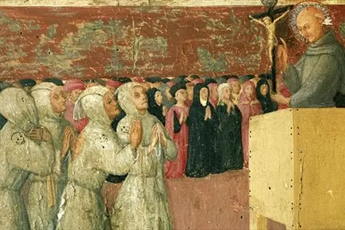 Per contro, Bernardino ebbe sempre parole di fuoco per i ricchi che, invece d’investire le loro sostanze in nuove attività che sarebbero state di generale giovamento, preferivano prestare a usura per conseguire un egoistico accrescimento delle loro fortune. Bernardino sosteneva che la “roba”, cioè l’insieme delle proprietà private di ciascuno, non appartiene all’uomo in quanto singolo individuo, dal momento che proviene da Dio, ma è per l’uomo in quanto essere sociale, come strumento per conseguire un miglioramento della società nel suo insieme. Altro tema costante e consueto della predicazione bernardiniana fu la riconciliazione tra le persone e le famiglie in lite e la risoluzione di contese. Nel 1425 egli predicò tutti i giorni per sette settimane nella città di Siena. La sua predicazione naturalmente gli provocò astio e inimicizia negli ambienti che egli fustigava con parole dure e molto sovente addirittura crude: ad esempio quello degli usurai e di chi teneva aperte le bische del gioco d’azzardo. Tali risentimenti dettero luogo anche a polemiche molto aspre, come quella con il domenicano Manfredi da Vercelli (un’interessante figura legata al modello, anch’esso domenicano, di san Vincenzo Ferrer) a proposito della figura dell’Anticristo, nonché a un’accusa insidiosa: quella di idolatria e di superstizione, pretesto della quale fu l’adorazione del Nome del Cristo (il trigramma IHS) di cui egli era ardente propagatore. Si giunse addirittura a un processo per eresia, che Bernardino sostenne a Roma nel 1427 e dal quale uscì indenne anche grazie alla sapienza e all’accortezza del teologo Paolo Veneto. Anzi, papa Martino V, che lo conobbe durante quel processo, ne rimase impressionato al punto di chiedergli di predicare anche a Roma: il ciclo romano di prediche di Bernardino, voluto dal papa, durò 80 giorni consecutivi con uno straordinario concorso di gente. Una predica durava mediamente un’ora: esistono tuttavia prediche documentate e trascritte che durano sino a quattro ore. Gli argomenti che egli trattava erano ardui, sovente fonte di scandalo, non di rado oggetto di discussione anche in seguito e fino ai giorni nostri: così le sue dure denunzie nei confronti del gioco d’azzardo, del lusso, dei rapporti omosessuali, delle pratiche abortive e stregoniche. La denunzia bernardiniana dei rapporti tra aborto e stregoneria è rimasta alla base della definizione della figura della strega dal Quattrocento al Settecento. A Roma Bernardino tornò nel 1433, per l’incoronazione solenne dell’imperatore Sigismondo. Ci volle tuttavia una bolla pontificia, emanata da Eugenio IV il 7 gennaio del 1432, per mettere del tutto a tacere i suoi calunniatori e detrattori.
