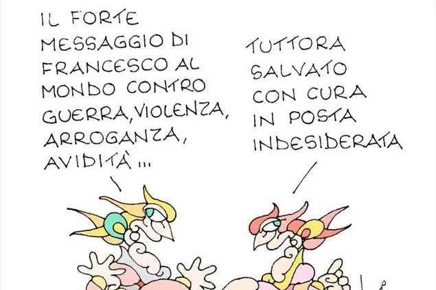 Le vignette - pubblicate nel numero di febbraio della rivista dei frati di Assisi e sul sito sanfrancesco.org - fanno sorridere, «e sorridere è uno dei doni più belli a disposizione dell'uomo», ha sottolineato il direttore del mensile, padre Enzo Fortunato. Certo - ha aggiunto - «il sorriso può essere anche beffardo e malvagio. Bisogna imparare a sorridere, leggermente, lievemente, dolcemente, per apparire subito amabili, favorevoli, sereni, per ispirare letizia». C'è il San Francesco di Altan con il nasone alla Cipputi. In molte delle vignette il Santo di Assisi è rappresentato mentre parla al lupo o predica agli uccelli, e Vignazia raffigura un reporter che lo intervista chiedendogli: «Ci dica Francesco, è difficile farsi capire dagli animali?'», e frate Francesco che risponde: «No. Molto più facile che farsi capire dai politici».