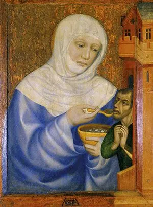 Nel 1224 Ludwig si unì alla crociata indetta da Onorio III, lasciando l’amministrazione del feudo alla moglie. Nel terribile inverno del 1225, in cui l’Europa fu flagellata da allagamenti, carestia, peste e vaiolo, Elisabetta cercò di far fronte alla situazione e di soccorrere i bisognosi. Il suo atteggiamento non fu gradito dagli amministratori, che temevano la sua eccessiva carità come pericolo alla sicurezza delle scorte alimentari della stessa corte. Sempre in quell’anno, Elisabetta favorì la fondazione di un convento francescano a Eisenach. Nel settembre 1227 Ludwig morì a Otranto. La notizia raggiunse Elisabetta in ottobre, poco dopo il terzo parto; si riferisce che esclamò: “Il mondo e le sue gioie sono ormai morti per me”. Lo zio vescovo voleva che si risposasse, nonostante Elisabetta, mentre il marito era ancora vivo, avesse fatto voto di castità in caso di morte dello sposo: ma il progetto non andò in porto. Le spoglie di Ludwig riportate in patria furono inumate nel monastero di Reinhardsbrunn. Scrive Conrad: “Elisabetta conobbe e amò Cristo nei poveri, incominciò presto a distinguersi in virtù e santità di vita… Distribuiva con larghezza i doni della sua beneficenza non solo a coloro che ne facevano domanda presso il suo ospedale, ma in tutti i territori dipendenti da suo marito. Arrivò al punto di erogare in beneficenza i proventi dei quattro principati di suo marito e di vendere oggetti di valore e vesti preziose per distribuirne il ricavato ai poveri. Aveva preso l’abitudine di visitare tutti i malati personalmente, due volte al giorno, al mattino e alla sera. Si prese cura diretta dei più ripugnanti. Nutrì alcuni, ad altri procurò un letto, altri portò sulle proprie spalle, prodigandosi sempre in ogni attività di bene, senza mettersi tuttavia per questo in contrasto con suo marito. Dopo la morte di lui, tendendo alla più alta perfezione, mi domandò con molte lacrime che le permettessi di chiedere l’elemosina di porta in porta”.