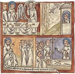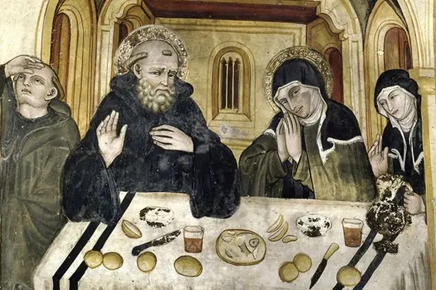 Ecco la pagina in cui li troviamo insieme. Tra loro è stato convenuto di incontrarsi solo una volta all’anno. E Gregorio ce li mostra appunto nella Quaresima (forse) del 542, fuori dai rispettivi monasteri, in una casetta sotto Montecassino. Un colloquio che non finirebbe più, su tante cose del cielo e della terra. L’Italia del tempo è una preda contesa tra i bizantini del generale Belisario e i goti del re Totila, devastata dagli uni e dagli altri. Roma s’è arresa ai goti per fame dopo due anni di assedio, in Italia centrale gli affamati masticano erbe e radici. A Montecassino passano vincitori e vinti; passa Totila attratto dalla fama di Benedetto, e passano le vittime della violenza, i portatori di tutte le disperazioni, gli assetati di speranza. Viene l’ora di separarsi. Scolastica vorrebbe prolungare il colloquio, ma Benedetto rifiuta: la Regola non s’infrange, ciascuno torni a casa sua. Allora Scolastica si raccoglie intensamente in preghiera, ed ecco scoppiare un temporale violentissimo che blocca tutti nella casetta. Così il colloquio può continuare per un po’ ancora. Infine, fratello e sorella con i loro accompagnatori e accompagnatrici si separano; e questo sarà il loro ultimo incontro. Tre giorni dopo, leggiamo nei Dialoghi, Benedetto apprende la morte della sorella vedendo la sua anima salire verso l’alto in forma di colomba. I monaci scendono allora a prendere il suo corpo, dandogli sepoltura nella tomba che Benedetto ha fatto preparare per sé a Montecassino; e dove sarà deposto anche lui, morto in piedi sorretto dai suoi monaci, intorno al 547.