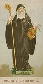 Il nome di Scolastica, sorella di Benedetto da Norcia, richiama al femminile gli inizi del monachesimo occidentale, fondato sulla stabilità della vita in comune. Benedetto invita a servire Dio non già “fuggendo dal mondo” verso la solitudine o la penitenza itinerante, ma vivendo in comunità durature e organizzate, e dividendo rigorosamente il proprio tempo fra preghiera, lavoro o studio e riposo. Da giovanissima, Scolastica si è consacrata al Signore col voto di castità. Più tardi, quando già Benedetto vive a Montecassino con i suoi monaci, in un altro monastero della zona lei fa vita comune con un gruppetto di donne consacrate. La Chiesa ricorda Scolastica come santa, ma di lei sappiamo ben poco. L’unico testo quasi contemporaneo che ne parla è il secondo libro dei Dialoghi di papa Gregorio Magno (590-604). Ma i Dialoghi sono soprattutto composizioni esortative, edificanti, che propongono esempi di santità all’imitazione dei fedeli mirando ad appassionare e a commuovere, senza ricercare il dato esatto e la sicura referenza storica. Inoltre, Gregorio parla di lei solo in riferimento a Benedetto, solo all’ombra del grande fratello, padre del monachesimo occidentale.