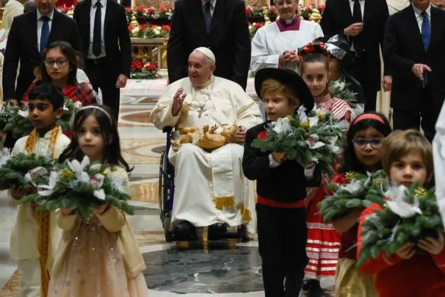 Perché la «mangiatoia serve a portare il cibo vicino alla bocca e a consumarlo più in fretta. Essa può così simboleggiare un aspetto dell’umanità: la voracità nel consumare. Perché, mentre gli animali nella stalla consumano cibo, gli uomini nel mondo, affamati di potere e di denaro, consumano pure i loro vicini, i loro fratelli. Quante guerre! E in quanti luoghi, ancora oggi, la dignità e la libertà vengono calpestate! E sempre le principali vittime della voracità umana sono i fragili, i deboli. Anche in questo Natale un’umanità insaziabile di soldi, potere e piacere non fa posto, come fu per Gesù, ai più piccoli, a tanti nascituri, poveri, dimenticati». Il Papa pensa soprattutto ai bambini, a quelli dell’Ucraina, ma anche a quelli di tanti altri posti del mondo dove vengono «divorati da guerre, povertà e ingiustizia. Ma Gesù viene proprio lì, bambino nella mangiatoia dello scarto e del rifiuto. In Lui, bambino di Betlemme, c’è ogni bambino. E c’è l’invito a guardare la vita, la politica e la storia con gli occhi dei bambini». Dio si accomoda «nella mangiatoia del rifiuto e della scomodità», dice il Pontefice, «perché lì c’è il problema dell’umanità, l’indifferenza generata dalla fretta vorace di possedere e consumare. Cristo nasce lì e in quella mangiatoia lo scopriamo vicino. Viene dove si divora il cibo per farsi nostro cibo. Dio non è un padre che divora i suoi figli, ma il Padre che in Gesù ci fa suoi figli e ci nutre di tenerezza. Viene a toccarci il cuore e a dirci che l’unica forza che muta il corso della storia è l’amore. Non resta distante e potente, ma si fa prossimo e umile; Lui, che sedeva in cielo, si lascia adagiare in una mangiatoia.»