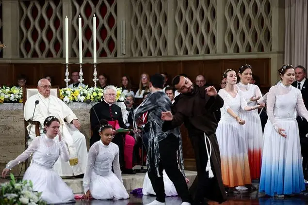 Il Pontefice, che al termine dell’incontro saluta anche i fedeli assiepati all’esterno, si sofferma su tre parole e, prendendo spunto anche dal balletto del Gruppo Laudato si’, parla di servizio, di missione e, soprattutto, di gioia.