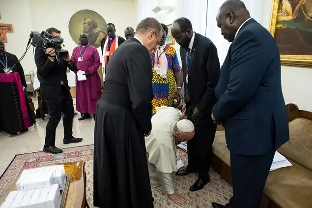 Si inginocchia, a fatica, davanti ai leader politici del Sud Sudan e bacia loro i piedi. Papa Francesco, al termine del ritiro spirituale per la pace nella martoriata regione africana si abbassa fino a terra davanti a Salva Kiir Mayardit, presidente della Repubblica e ai vicepresidenti designati Riek Machar Teny Dhurgon, Taban Deng Gai e Rebecca Nyandeng De Mabio, vedova del leader sud sudanese, John Garang. Infine consegna loro una Bibbia firmata da lui, dall’arcivescovo di Canterbury e primate della Comunione anglicana Justin Welby, che haa fortemente voluto l’incontro, e dal reverendo John Chalmers, già moderatore della Chiesa Presbiteriana di Scozia, con il messaggio: «Ricerca ciò che unisce. Supera ciò che divide». Ed è l’unione che il Papa ha raccomandato ai leader politici reduci da una guerra civile che, dal 2013, ha causato oltre quattro milioni di sfollati 400mila morti. «Voi avete avviato un processo», dice pensando al 17esimo accordo per la pace che entrerà in vigore il 12 maggio. «Che finisca bene. Ci saranno lotte tra voi», continua Francesco, «ma che queste restino dentro l’ufficio. Davanti al popolo le mani unite, così da semplici cittadini diventerete padri di nazioni. Permettetemi di chiederlo con il cuore, con i sentimenti più profondi».