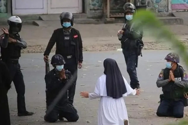 «Credo che Dio si sia servito di me. Lo Spirito Santo mi ha dato la forza di affrontare da sola i militari armati». Suor Ann Rose Nu Tawng, 44 anni, lavora come infermiera nella clinica diocesana di Myitkyna in Myanmar ed è diventata l’icona delle proteste nel suo Paese perché, disarmata, si è inginocchiata due volte di fronte alla polizia, pregando di uccidere lei, non la gente. In un'intervista esclusiva che Famiglia Cristiana pubblica nel numero in edicola da giovedì 15 aprtile, la relgiiosa spiega: «Molti giovani qui hanno studiato all’estero, hanno fatto esperienza della libertà nei Paesi in cui hanno vissuto e vogliono lo stesso per il loro popolo. I militari hanno ucciso alcuni di loro impegnati nelle proteste. Li ammiro e prego per loro».