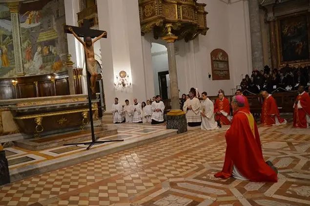L'adorazione della Croce. L'immagine del Crocifisso viene portata solennemente su un cuscino verso l'altare maggiore: per tre volte la croce viene innalzata, mentre si canta l'antifona "Ecce lignum Crucis in quo salus mundi pependit" ("Ecco il legno della croce, al quale fu appeso il salvatore del mondo") e per tre volte tutti si inginocchiano davanti a essa in adorazione. Nuovamente la Croce, dopo essere stata deposta sui gradini dell'altare, viene adorata con tre genuflessioni e con un bacio di venerazione all'immagine del crocifisso. La preghiera universale nella quale si prega solennemente per le necessità della Chiesa e del mondo.