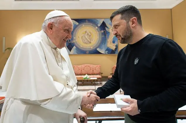 «Grazie della visita», «Per me è un onore». Le prime parole di Papa Francesco e del presidente Zelensky il Pontefice e il leader ucraino se le scambiano sulla porta dell’auletta Paolo VI. Bergoglio è in piedi, appoggiato al bastone. Zelensky appoggia la mano sul cuore e china la testa. Poi 40 minuti di colloquio riservatissimo alla presenza del solo francescano ucraino fra Marek Viktor Gongalo. Tra le cose rese note lo scambio dei doni. Il Pontefice ha regalato una scultura raffigurante un ramoscello d’ulivo, simbolo di pace, il Messaggio per la Pace di quest'anno, il Documento sulla Fratellanza Umana, il libro sulla Statio Orbis del 27 marzo 2020, a cura della Lev e il volume "Un'Enciclica sulla pace in Ucraina". Zelesky, invece, ha donato al Papa un quadro intitolato "Perdita", sull'uccisione dei bambini durante il conflitto.