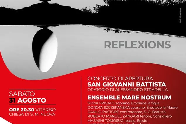 A Viterbo l’oratorio “San Giovanni Battista” viene eseguito dalla collaudata Ensemble Mare Nostrum, diretta dal maestro e direttore artistico del Festival, Andrea De Carlo. Gli interpreti sono i soprani Silvia Frigato (nel ruolo di Erodiade la figlia) e Dorota Szczepańska (Erodiade la Madre), il controtenore Danilo Pastore (San Giovanni Battista), il tenore Roberto Manuel Zangari (il Consigliero) e il basso Masashi Tomosugi (Erode).
