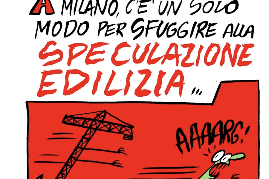 Il fumetto ruota attorno a una creatura inventata ma fin troppo riconoscibile: il Succhiasuolo, speculatore immobiliare travestito da vampiro — o forse il contrario. È chi compra un immobile Aler per rivenderlo a pezzi in un food hub di lusso. Chi svuota una piscina pubblica per farci uno studentato da cinquecento euro a stanza. Chi trasforma un quartiere in una vetrina per «cittadini brevi» — turisti, studenti di passaggio, manager in trasferta — che stanno poco, non fanno domande, non disturbano.