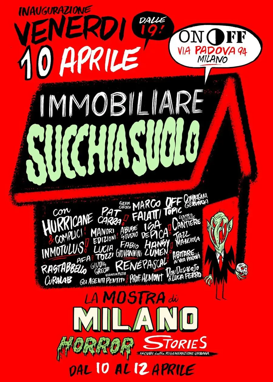 Dal 10 al 12 aprile, lo spazio ONOFF di Via Padova 94, cuore pulsante di quella Milano di quartiere che resiste alla vetrinizzazione, ospita la mostra multimediale Milano Horror Stories, tratta dall'omonimo fumetto horror satirico pubblicato da AFA Edizioni (Autoproduzioni Fichissime Andergraund). Ingresso libero. L'inaugurazione è venerdì 10 aprile dalle ore 19, con consegna di rogiti immaginari e debutto di due nuove pubblicazioni: Anatomia di un Succhiasuolo di Manori Edizioni e la Guida ai Succhiasuolo Milanesi. Sabato si aprirà alle 16, domenica alle 15.