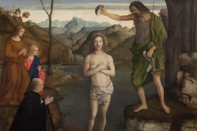 (Sopra: "Battesimo" di Giovanni Bellini, dipinto conservato a Venezia nella Chiesa Granpriorale di San Giovanni del tempio dell'ordine di Malta. In copertina: "Madonna con il Bambino, Musei Civici di Treviso)
