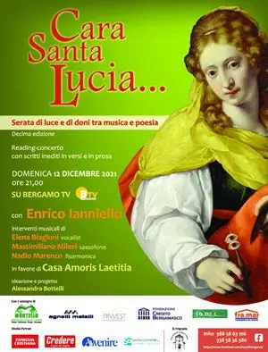 Per il decimo anno consecutivo torna a Bergamo «Cara Santa Lucia… - Serata di luce e di doni tra musica e poesia», il tradizionale reading-concerto di beneficenza dedicato alla santa più amata dai bambini. Domenica 12 dicembre, alle ore 21, dagli studi televisivi di Bergamo TV, il popolare attore Enrico Ianniello, apprezzato interprete di fiction televisive, ma anche scrittore e regista teatrale, presterà la sua voce per dare espressione di suono alle parole inedite create appositamente per l’occasione da poeti e scrittori italiani. Dal 2012 ad oggi sono stati oltre 140 gli autori che hanno voluto dare il proprio personale contributo alla manifestazione: da Camilleri alla Maraini, da Lucarelli a De Giovanni, da Scarpa a De Luca, Benni, Starnone, Maggiani, Ceronetti, Albinati, Affinati, Scurati, Doninelli, Pariani, Gualtieri, Murgia, Cucchi, Magrelli, Lamarque e tanti altri, compreso il regista Ermanno Olmi e il due volte Premio Oscar Ennio Morricone, che ha composto un brano musicale dedicato alla martire siracusana. Tra i nomi presenti quest’anno ricordiamo quelli di Sandro Veronesi (insignito per ben due volte del prestigioso Premio Strega con i romanzi Caos calmo e Il colibrì), Elisabetta Rasy (autrice de Le disobbedienti e Le indiscrete), Lidia Ravera (scrittrice e sceneggiatrice, finalista al Premio Strega nel 2008), Sandra Petrignani (ha firmato La corsara, biografia di Natalia Ginzburg, finalista al Premio Strega e Premio Dessì nel 2018). La tradizionale “letterina” che chiuderà la serata avrà la firma di Mariapia Veladiano (recente vincitrice del Premio Flaiano per la narrativa con il romanzo Adesso che sei qui). Ma saranno letti anche i testi di Cristiano Cavina, Paola Capriolo e Andrea Tarabbia, (vincitore del Premio Campiello 2019 con Madrigale senza suono).