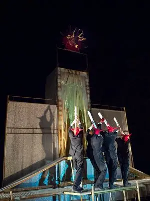 Grazie al palcoscenico sopraelevato, questo spettacolo di strada tout public può essere visto anche da una vasta platea. La scenografia è un insieme di piani, scale e passerelle che compongono uno spazio che continuamente si trasforma, all’occorrenza può diventare una piazza, un night club, un palazzo, una strada, un set televisivo.