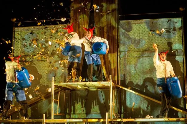 Questi diavoli sono venuti per annunciare alla gente i nove comandamenti del Dio Denaro, promettono una ricca ricompensa a chi vive la propria vita senza riguardo e a discapito degli altri. La storia si presenta come un varietà grottesco guidato da un Vitello d’oro, l’idolo che nella Bibbia gli uomini sostituiscono a Dio e che, sospeso in cima all’altare, dirige l’azione. Attraverso balli selvaggi, gozzoviglie sfrenate e perfide manovre, i diavoli si divertono a presentare agli uomini i loro peccati. Ma degli intermezzi poetici rallentano i ritmi frenetici della scena, quattro vecchi salgono sul palco inondato di colori caldi e regalano azioni legate al senso di una vita vera che si contrappongono alle “diavolerie”: gli alberi e il canto degli uccelli, la memoria, l’amicizia, la casa, la condivisione