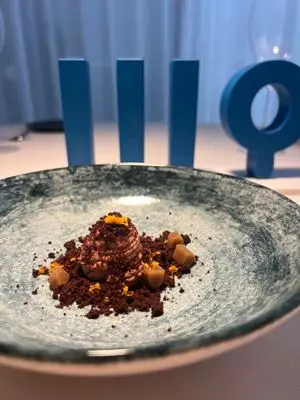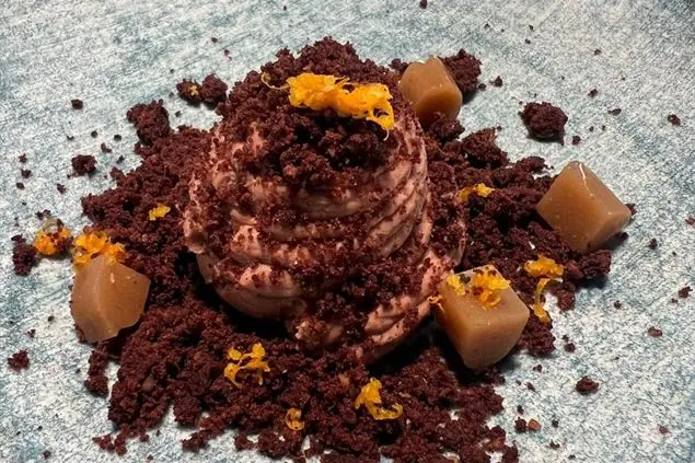 GANACHE AL CIOCCOLATO FONDENTE, POLVERE DI BISCOTTO, GELATINA E ZEST DI ARANCIA
