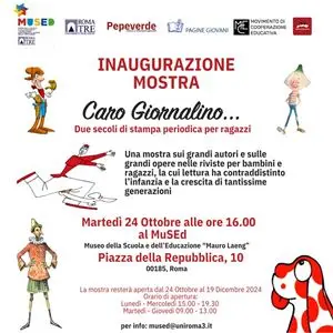 l percorso della mostra, oltre a spiegare l’origine e l’evoluzione dei “giornalini”, espone i più importanti e rari periodici per ragazzi dell’Ottocento e del Novecento italiano posseduti dal MuSEd, come il Corriere dei Piccoli, Il Vittorioso, Il Pioniere, Il Giornalino della Domenica. Si potranno vedere gli originali “a puntate” di opere celebri come Le avventure di Pinocchio e Il giornalino di Gian Burrasca, oppure personaggi come Bonaventura di Sergio Tofano, Cocco Bill di Jacovitti o la Pimpa di Altan. Proprio nei giornalini si sono infatti formati grandi autori, come Emilio Salgari e Gianni Rodari, così come i grandi maestri dell’illustrazione e del fumetto italiani, che hanno alimentato l’immaginario dei giovani lettori con tavole indimenticabili. Per il Giornalino, ad esempio, hanno lavorato grandi fumettisti come Dino Battaglia, Giannio De Luca, Franco Caprioli, Sergio Toppi, Gino Gavioli, Massimo Mattioli. La mostra invita a considerare l’importanza e il valore che i giornalini hanno avuto nel passato e che in parte hanno ancora oggi, continuando la loro “missione” e cercando nella rete nuove adeguate opportunità per veicolare i loro contenuti. Il progetto della mostra è nato dalla collaborazione tra il Dipartimento di Scienze della Formazione dell'Università di Roma Tre, le riviste Pepeverde e Pagine Giovani, la casa editrice Edizioni Conoscenza e l’MCE, Movimento di Cooperazione Educativa. La mostra resterà aperta dal 24 ottobre al 19 dicembre, una visita virtuale sarà disponibile sul sito dell’Università Roma Tre.