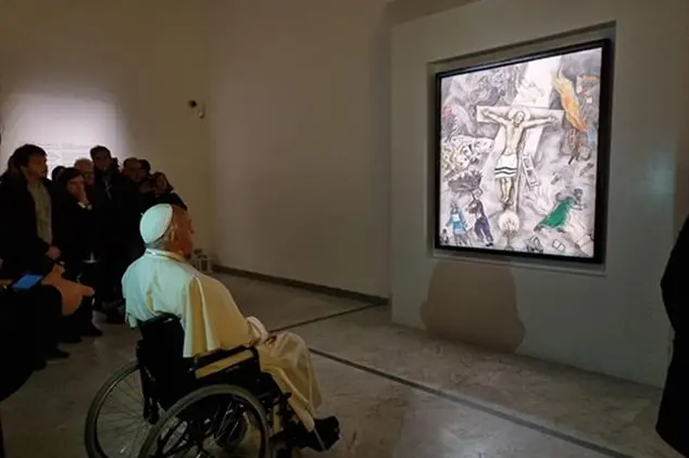 (Foto in alto: il Papa contempla e medita davanti alla Crocifissione Bianca di Marc Chagall, durante la significativa visita dell'8 dicembre. Fonte: ANSA)