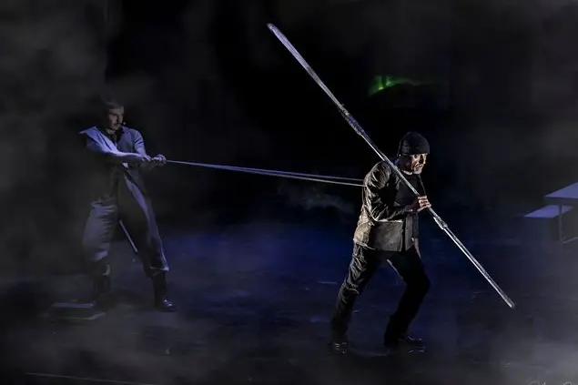 Il tono del racconto omerico passa dalla lirica a quello della tragedia greca, evidenziato in scena dal coro mediterraneo-alpino, in cui spicca la voce straordinaria di Saba Anglana, e che spazia da “Stand by me” alle canzoni di Demis Roussos. E’ proprio in questa dimensione che il naufrago-errante Ulisse può ritrovare la sua eroicità tragica, la possibilità di riscatto e di resistenza al “capriccio” del nuovo demiurgo, nella scelta decisiva, l’unico atto incondizionato che gli resta: accettare la seducente offerta di immortalità, o “resistere”, e rimanere, cioè, uomo fino in fondo, per costruisce la propria speranza di futuro, restando padre a fianco del figlio Telemaco e rivendicando il diritto ad invecchiare. Dilemma tragico, appunto, ma che tiene aperta la possibilità della catarsi finale.