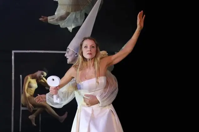 La chiave dello spettacolo sta su una sola intuizione: che i morti non camminano, volano, sono senza peso. Tecnicamente questo effetto risulta dalla riflessione sul piano verticale degli attori e danzatori sdraiati per terra. Chi viaggia nel mondo dei morti è inesorabilmente attratto verso la terra, finché non si sdraia. Cioè accetta di morire. La protagonista, interpretata da Viola Graziosi, percorrendo un mondo sospeso tra la vita e la morte, incontrerà i protagonisti della sua vita, e dopo aver fatto i conti col passato, avrà la leggerezza necessaria per volare via. Protagonista assoluto di questo mondo, compagno di questo viaggio iniziatico nel mondo dei morti, è Virgilio, interpretato da Graziano Piazza. Uno spettacolo in cui i generi si intersecano, dove prosa, danza, musica e l’illusione scenica si fondono insieme. I confini e le distanze tra attori e danzatori vengono aboliti.