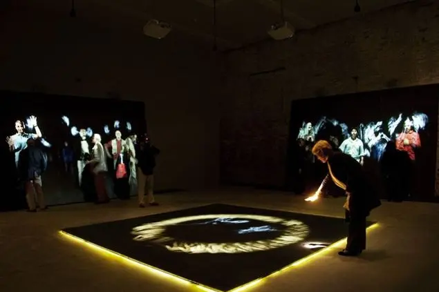 Diamo la parola agli artisti (www.studioazzurro.org): «L’opera realizzata per il Padiglione Vaticano affronta il tema della Creazione e si offre al visitatore come la scatola di un cosmo appena dischiuso.Si tratta di un "ambiente sensibile" progettato appositamente per l’esposizione veneziana. Un'installazione interattiva, composta da lastre di pietra (tre verticali e una orizzontale), di fronte alle quali lo spettatore è chiamato a interpellare con la mano i personaggi che le popolano in forma di proiezioni. Il racconto di ognuno, in parole o in figure, viene da persone che vivono quotidianamente una costrizione dell'esperienza dello spazio e del tempo (carcerati) o una forte limitazione del linguaggio verbale (sordomuti). I primi tentano un ricongiungimento ideale al mito delle origini, ripercorrendo la propria genealogia, mentre i secondi plasmano lo spazio davanti a sé con le scie dei gesti che descrivono elementi del mondo animale e vegetale. La lastra orizzontale al centro, inizialmente simile a una lavagna senza memoria, si fa deposito delle relazioni, raccogliendo i gesti rilasciati dalle interazioni come organismi di luce, impalpabili ingranaggi che rigenerano costantemente un cosmo da decifrare. Lo spettatore, sollecitato a entrare in contatto con i personaggi per attivare la loro storia, per risonanza, attiva anche la propria, superando la dimensione formale per immergersi nel concetto di origine, rivitalizzandolo attraverso l'esperienza della relazione, e contribuendo così a generare un’opera di esperienza, appunto, e non di rappresentazione».