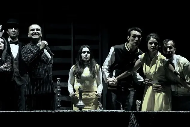 Resa nota dal fumetto, creato da Charles Addams negli anni ’30, poi dalla celebre serie televisiva degli anni ‘60, conosciuta anche dai giovani di oggi per cartoni animati, film, videogiochi, nonché dallo spettacolo rappresentato nel 2010 a Broadway, la famiglia Addams è ora protagonista del musical, creato dalla Compagnia della Corona che sceglie di mettere in scena la famosa famiglia che ama il macabro e che si prende in giro con umorismo nero. All’interno del nucleo familiare tutti si vogliono bene e si accettano per come sono, nonostante le loro stranezze, e vivono, anche se con originalità, le tensioni di ogni tempo. Con la canzone Se sei un Addams, che rappresenta il leitmotiv dello spettacolo, si apre un musical grazioso, vivace e divertente con canzoni orecchiabili e musiche incisive che spaziano dalle atmosfere spagnoleggianti, al romantico, alla tensione horror. Nella vita della famiglia Addams, che dall’esterno appare non troppo “normale”, si verifica un evento che rischia di mettere in crisi la loro serenità comune: Mercoledì (Antea Galli), la figlia adolescente, si innamora di un giovane “normale” e desidera invitarlo a casa per conoscere tutti i suoi parenti, immaginando già di poterlo presto sposare. I genitori del neofidanzato devono così entrare in una casa spettrale, isolata in una foresta, circondata da lapidi, dove sono accolti da Lurch, un inquietante maggiordomo, e poi incontrano i futuri suoceri, Gomez (Andrea Rodi), con il suo accento spagnolo e una voce possente, sempre armato di spada, e Morticia (Barbara Corradini), dark lady dai lunghi capelli corvini, che fa gelide battute sulla gioia procurata dall’infelicità. Ci sono anche la nonna, che parla di morti, lo zio Fester, innamorato della luna e il terribile fratellino della ragazza Pugsley, che si addormenta solo con l’apparizione di orribili mostri, mentre il cugino Itt, dai lunghi capelli biondi, si aggira tra il pubblico. Morticia osteggia il nuovo amore della figlia, temendo di perderla e soprattutto ha paura che rinneghi le sue abitudini, rimanendo particolarmente turbata quando la vede apparire vestita di giallo e con i capelli sciolti, invece che con le solite treccine e i vestiti neri, tratto distintivo della famiglia. Alla madre si contrappone il padre, che vuole assecondare la sua piccola che sta crescendo, usando ironia e fermezza per convincere la moglie, con il supporto dei genitori di Lucas, nonostante le loro perplessità iniziali. Il gioco crudele, che si svolge alla fine della cena di conoscenza delle famiglie, in cui ognuno deve rivelare un segreto, sulle note della canzone Tutto fuori, diventa trascinante nella seconda parte dello spettacolo, in cui ognuno ritrova la propria identità e tutti comprendono l’importanza di essere sinceri e non avere mai segreti con i membri della propria famiglia. Alla fine, l’amore trionfa sia per i giovani, sia rinsaldando le coppie dei rispettivi genitori, che trovano il modo di chiarirsi: mostrare le proprie caratteristiche, seppure originali, è sempre positivo, pur di rimanere se stessi e non tradire la propria natura. Il regista Salvatore Sito sceglie di puntare sull’ambientazione in bianco e nero, così da riprender la famosa serie tv, inserendo numerose scene comiche e anche alcune poetiche proiezioni video, sempre in bianco e nero, per rappresentare alcune vicende che si svolgono in esterno, come quando la famiglia di Lucas si perde nel bosco o il viaggio sulla luna dello zio. Alterna, inoltre, parti recitate a numerosi brani cantati, sia in assolo dai protagonisti, tutti ottimi interpreti, per meglio caratterizzare il personaggio, che da tutta la compagnia per sottolineare i punti salienti dell’azione. Anche le coreografie sono realizzate in stile Addams con alcune figure che a volte compaiono sulla scena e che interpretano gli antenati morti, vestiti con pizzi e merletti antichi, come fantasmi in bianco e con il volto pallidissimo, ma che si muovono e cantano in modo vivace e vitale, consigliando e affiancando gli interpreti principali.