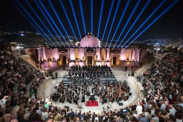 Dopo un pranzo con la ministra della cultura Haifa Najar, il ministro del turismo Makram Al Queisi e l’ambasciatore italiano Luciano Pezzotti, la sera del 9 luglio Riccardo Muti porta “Le vie dell’Amicizia” a Jerash, l’antica città che i romani chiamarono Gerasa,. A poco più di un’ora di automobile da Amman, la città di Jerash vanta un’antica ed ininterrotta occupazione di insediamenti umani da oltre 6.500 anni. Nascosta per secoli nella sabbia del deserto, Jerash è stata scavata e riportata ala luce negli ultimi 70 anni. I resti della città romana sono imponenti. Spiccano la strada colonnata, l’Arco di Adriano, il Ninfeo, l’Ippodromo, i due teatri. Il concerto si svolge all’interno del Teatro Sud, costruito fra il 90 e il 92 dopo Cristo, durante il regno dell’imperatore Domiziano. Un edificio molto apprezzato per la sua acustica.