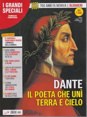 Ricordiamo il numero speciale a cura della redazione di Famiglia cristiana Dante, il poeta che unì cielo e terra, ha 100 pagine e affronta con ben 30 articoli il mondo dantesco, le sue trasposizioni, l’influenza nell’arte e nella letteratura. Dante nei fumetti, al cinema, su Internet, nei libri per bambini, Dante e le donne, Dante e la scienza, Dante e la cucina. E poi mostre, luoghi e itinerari danteschi, e per concludere le testimonianze di voi lettori.Lo speciale è disponibile in edicola, in parrocchia e su www.edicolasanpaolo.it. È possibile richiederne copie anche al n. 02.48027575 oppure inviando una email ad abbonamenti@stpauls.it.