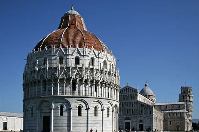 Lo stesso capita anche osservando la Piazza dei Miracoli. La chiesa, dalle mura, sembra unita al campanile, e il Battistero sembra avere una copertura uniforme, non due tegole di colore diverso. La torre resta storta anche dalle mura, non preoccupatevi; ma tutto il resto, da un altro punto di vista, vi appare con diversa chiarezza.