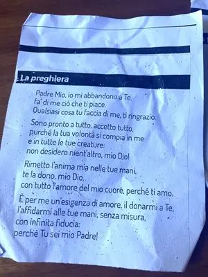 «Padre Mio, io mi abbandono a Te, fa di me ciò che ti piace. Qualsiasi cosa tu faccia di me, ti ringrazio. Sono pronto a tutto, accetto tutto, purché la tua volontà si compia in me e in tutte le tue creature: non desidero nient’altro, mio Dio! Rimetto l’anima mia nelle tue mani, te la dono, mio Dio, con tutto l’amore del mio cuore, perché ti amo. È per me un’esigenza di amore, il donarmi a Te, l’affidarmi alle tue mani, senza misura, con infinita fiducia: perché Tu sei mio Padre!»