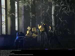 Niente orpelli, piume di uccelli, solenni processioni di sacerdoti, richiami all'Egitto. Insomma, addio al solito vecchio armamentario visto cento volte. “Quello che è veramente importante, quando si lavora su un classico, è che il classico dialoghi con il contemporaneo, cercando di togliere le cose più prevedibili, già viste, banali”, dice Michieletto. Operazione perfettamente riuscita. Nulla sembra fuori posto, nessuno si scandalizza, tutto diventa perfettamente plausibile. Anche la comparsa da un armadio, nel finale, di quattro minuscoli bimbetti nei panni dei Papagenini.