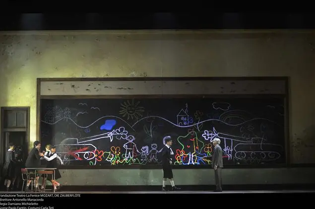 Il regista Damiano Michieletto, il quarantenne veneziano ormai celebre in tutto il mondo per le sue letture mai scontate dei capolavori della lirica, ambienta l'opera di Mozart in una scuola. Ci sono il banco, la lavagna, un armadio. Tamino è uno scolaretto in grembiulino, Papageno è un bidello claudicante, la Regina della notte è una madre isterica e impasticcata, i tre fanciulli indossano tute da lavoro e caschi da minatori con la torcia accesa, come è giusto per chi deve saggiamente far da guida quando i protagonisti vivono i loro momenti bui. Quando occorre, le scene disegnate da Paolo Fantin ci portano nella stanza di Pamina o in un bosco, senza alcun sovraccarico di simboli.