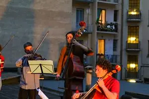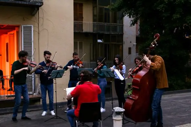 È una serata luminosa di primavera. All’inizio il cielo fa temere qualche goccia di pioggia «ma se il parroco ha detto che non piove, ci fidiamo: avrà parlato con le “alte sfere”» scherzano i primi spettatori che, poco alla volta, prendono posto in una “platea” decisamente insolita, con vista sul cortile e sui balconi dei palazzi circostanti. Poco dopo l’aria si rasserena e i musicisti fanno il loro ingresso sul “palco”, sistemandosi con violini, viole, violoncello e contrabbasso, tra i comignoli del tetto.