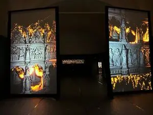 La Sala del Rivellino si trasforma in un grande cinema: il buio è squarciato da due grandi schermi che accolgono il visitatore, inondandolo della luce, del fuoco che scaturisce (quasi un’onda magmatica) dalla grande Arca conservata in San Pietro in Ciel d'Oro: è l'aprirsi al mistero luminoso del pensiero del teologo. Avvicinandosi, qualcosa sorprende: l'immagine proiettata, grazie ai sofisticati dispositivi, entra in relazione con la persona, che con la visione di fuoco può dialogare, immergendosi letteralmente in essa in un movimento dal basso verso l’alto in una salita continua, come ad indicare un portale da attraversare. L’immagine delle opere d’arte costitutive dell’iconografia del personaggio domina ricoprendo puntualmente tutte le superfici della stanza e dando così vita a un exhibit interattivo composto da una superficie touch e da una grande proiezione sincronizzata su un maestoso fondale. Qui il dialogo creativo con l'immagine si amplifica e, continuando il gioco interattivo, grazie al grande touch-screen di semplice utilizzo, ci si inoltra nella storia dell'arte.