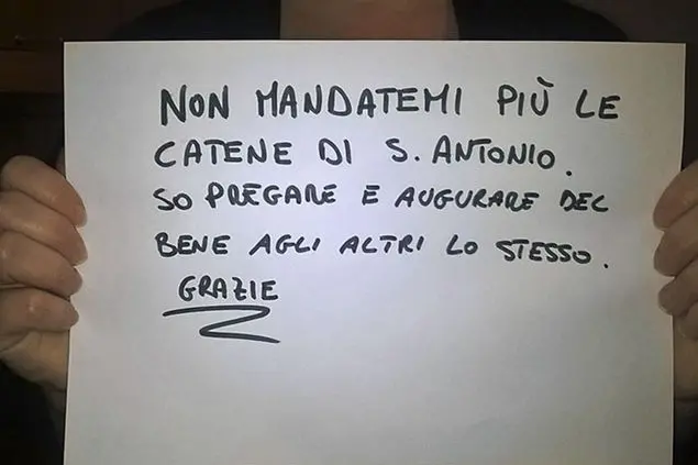 M. ROSA - A distanza di pochi giorni ho ricevuto ben due richieste di trasmissione ad altre nove persone di due immaginette (sant’Antonio e Madre Teresa) con relativa preghiera e promessa di “grazie” speciali. Come comportarmi?