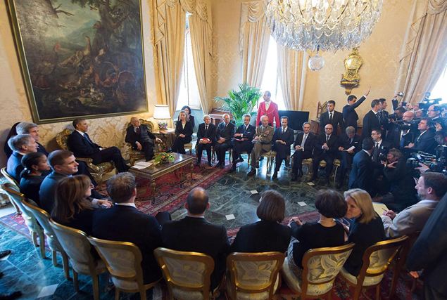 «L'Italia è fortunata ad avere un uomo di Stato così forte, che aiuta il Paese in momenti così difficili». Così Barack Obama ha parlato dell'incontro con il presidente della Repubblica in conferenza stampa a Villa Madama. Il presidente Usa si è trattenuto oltre due ore al Quirinale, più di quanto originariamente previsto dal programma