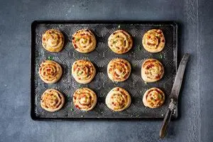 Ritagliare con un coltello seghettato delle girelle dallo spessore di 2 cm e adagiarle su una teglia rivestita con carta da forno. Coprire le girelle con un canovaccio pulito e lasciarle lievitare in un posto tiepido per 60 minuti.