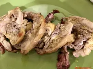 Nella Valle d’Itria buona parte delle macellerie di paese, un paio di volte a settimana, offrono il servizio di “fornello pronto”. Il fornello, come si può intuire dal nome, è uno pseudo forno stretto e alto, alimentato a legna, la carne viene messa sugli spiedi e la cottura avviene lentamente e a fuoco indiretto. Ai Tre Punti resta una delle pochissime macellerie dove ancora la tradizione resite. La sua fortuna è sia quella di essere ubicata in una frazione di Cisternino, defilata dalla calca turistica, sia la visione dei titolari, che hanno preferito mantenere pochi tavoli a cui servire solo carne e prodotti davvero locali. Non di rado capita di dover rinunciare ad alcune specialità semplicemente perché le poche porzioni finiscono in fretta. Il menù lo si decide al banco della macelleria, si scelgono direttamente i tagli di carne che andranno in cottura sugli spiedi. Abbiamo optato per delle belle fette di pollo ruspante disossato e ripieno, davvero eccezionale, con la giusta umidità all’interno e la pellicina croccante fuori, ovviamente cotto nel fornello.
